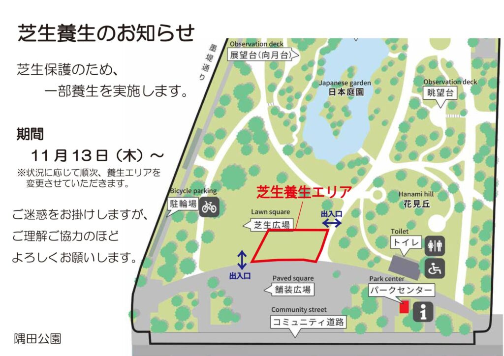 2025年11月13日(木)から、芝生保護のため芝生広場の一部で養生を行っています。
